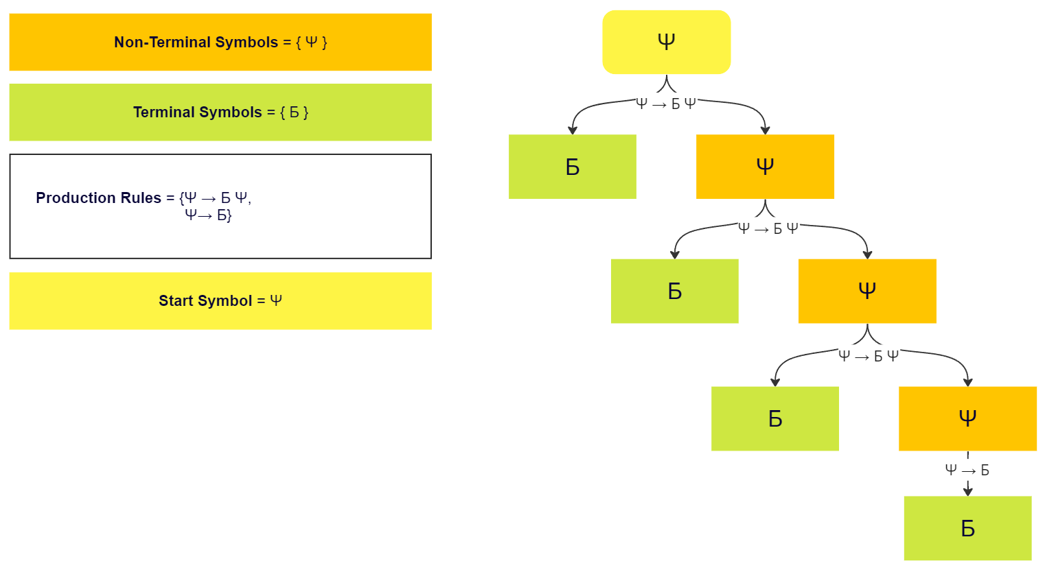 Figure: This is an example of how to get string “ББББ” from the given start symbol “Ψ” by applying the given production rules. Use this diagram to understand what terminal and non-terminal symbols mean and how production rules can be applied to generate sequences. Image from here