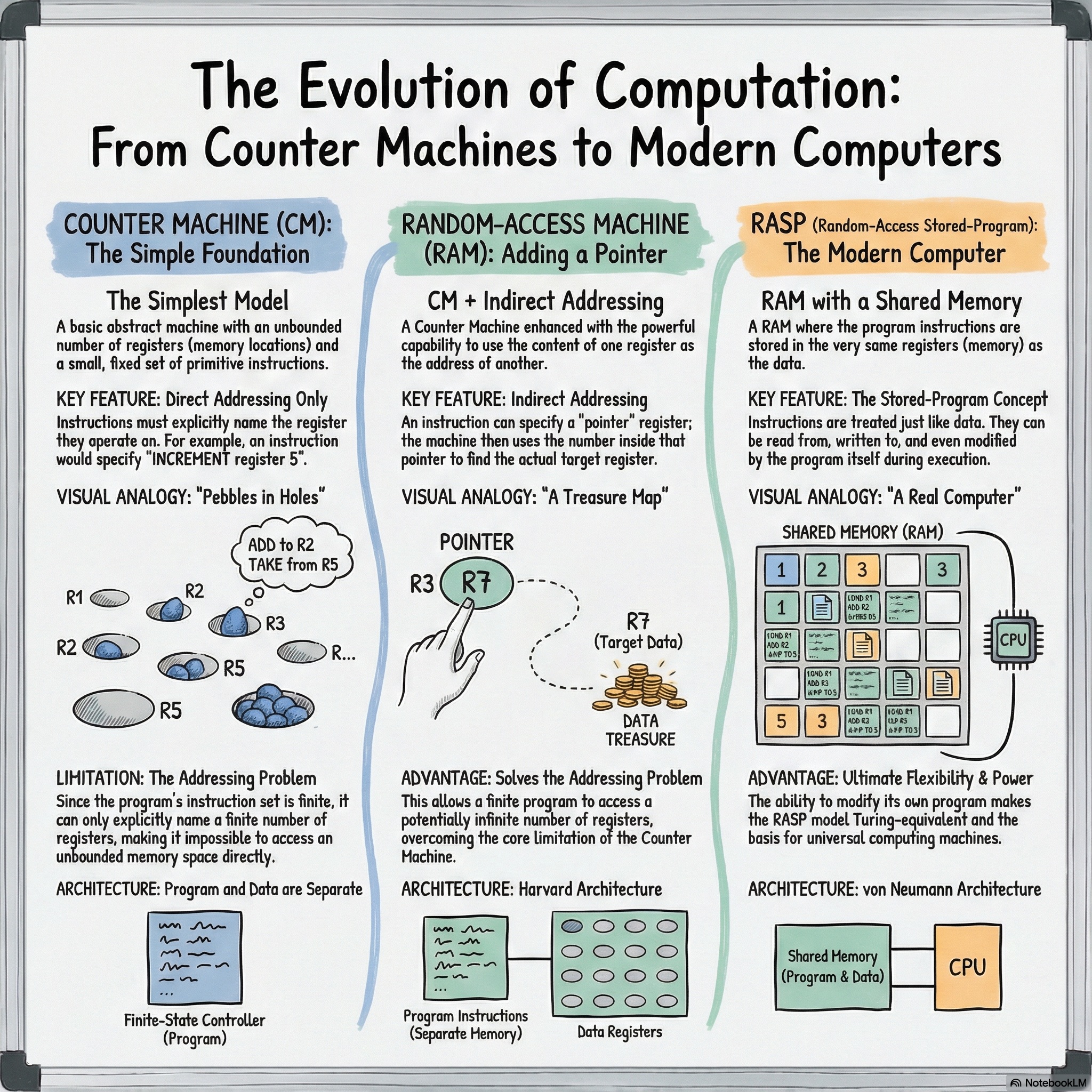 | Pointer Machine | Object-Oriented Runtimes (JVM, Python). While they run on RASP hardware, the "virtual machine" behaves like a pointer machine, managing a "heap" of connected objects. |